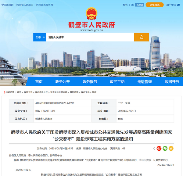 2023年07月24日,鹤壁市人民政府印发了关于鹤壁市《深入贯彻城市公共交通优先发展战略高质量创建国家“公交都市”建设示范工程实施方案》的通知(鹤政〔2023〕13号)。