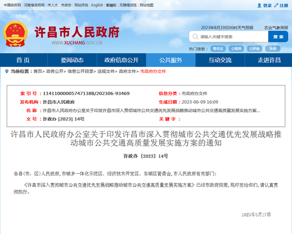2023年5月27日 ,许昌市人民政府印发了关于《许昌市深入贯彻城市公共交通优先发展战略推动城市公共交通高质量发展实施方案》(许政办 [2023] 14号)。
