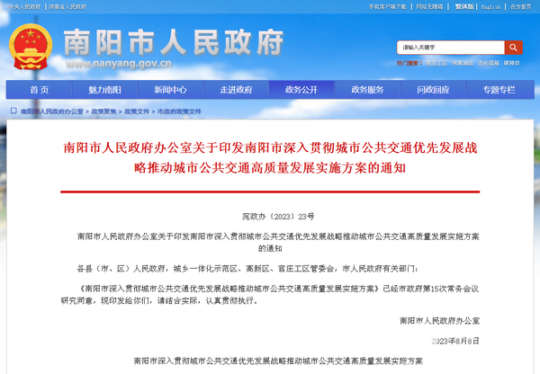 2023年8月8日,南阳市人民政府印发了关于《南阳市深入贯彻城市公共交通优先发展战略推动城市公共交通高质量发展实施方案》的通知(宛政办〔2023〕23号)。