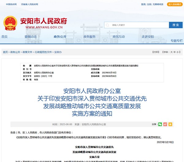 2023年5月18日,安阳市人民政府印发了关于安阳市《深入贯彻城市公共交通优先发展战略推动城市公共交通高质量发展实施方案》的通知(安政办〔2023〕11号)。