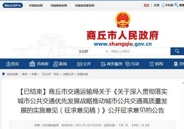 2023年5月29日,商丘市交通运输局印发了《关于深入贯彻落实城市公共交通优先发展战略推动城市公共交通高质量发展的实施意见(征求意见稿)》。