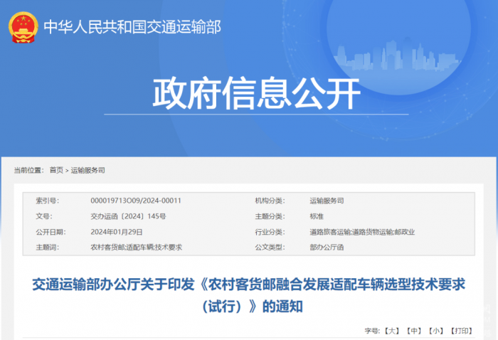国务院发布《农村客货邮融合发展适配车辆选型技术要求(试行)》