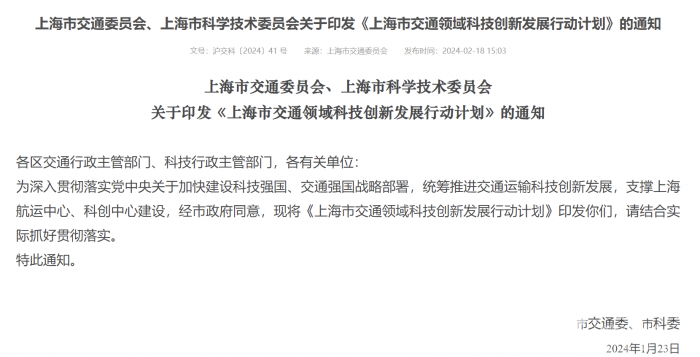 为贯彻落实科技强国、交通强国战略部署,统筹推进本市交通领域科技创新发展,支撑本市交通行业更好开展数字化、智能化、绿色化转型工作,促进新技术与交通运输行业深度融合,根据《交通领域科技创新中长期发展规划纲要(2021–2035年)》(交科技发〔2022〕11号)、《“十四五”交通领域科技创新规划》(交科技发〔2022〕31号)等文件,市交通委、市科委联合编制《上海市交通领域科技创新发展行动计划》(以下简称《行动计划》),经市政府同意,近日正式印发。