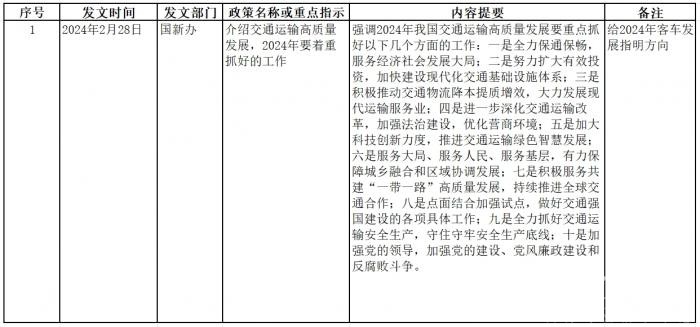 评析:客车行业是我国具体运输业中一个不可分割的部分。从国新办发布的2024年交通运输也要着抓好的工作来看,2024年客车行业的主要增长点在:
