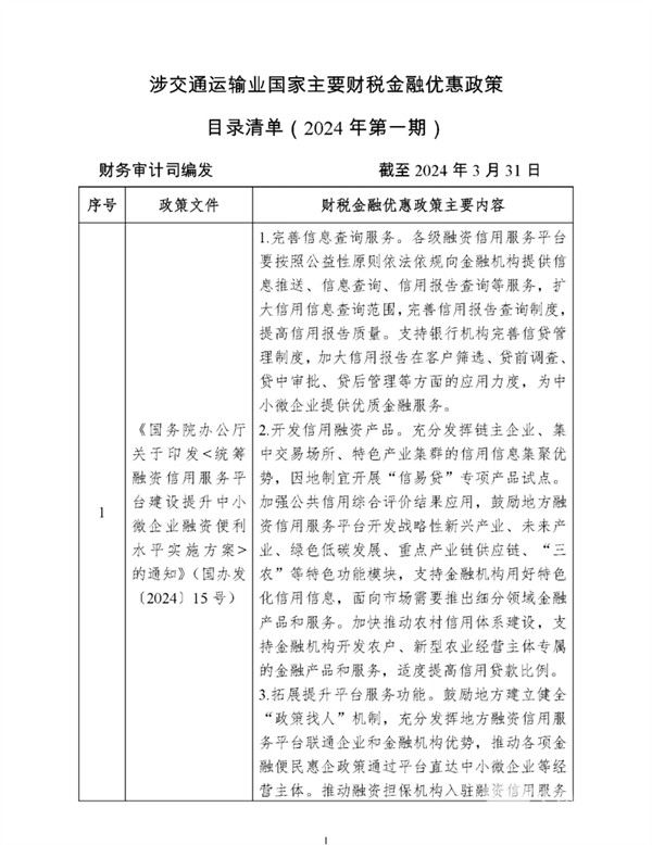 为帮助交通运输企业和从业者及时了解国家出台的财税金融支持政策内容,用足用好优惠政策,我部梳理形成了《涉交通运输业国家主要财税金融优惠政策目录清单》(2024年第一期,2023年10月10日至2024年3月31日),本期《清单》共包括11项财税金融优惠政策。