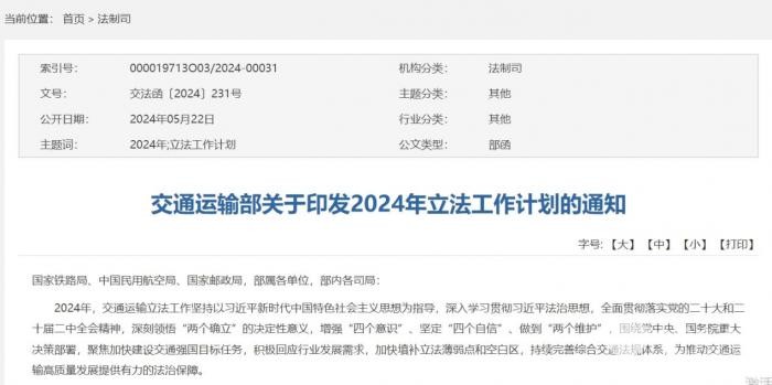 交通运输部印发《2024年立法工作计划》 这些内容值得关注
