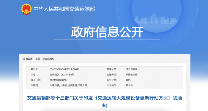 交通运输部等十三部门关于印发《交通运输大规模设备更新行动方案》