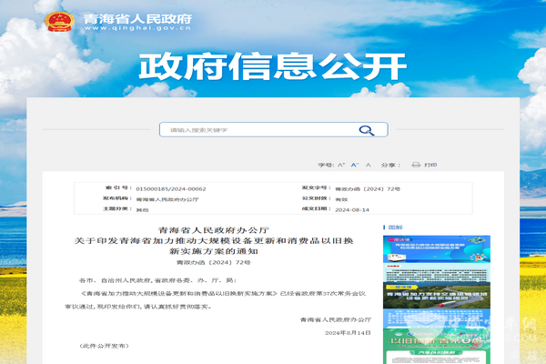 2024年8月14日,青海省人民政府印发了青海省《加力推动大规模设备更新和消费品以旧换新实施方案》的通知【青政办函〔2024〕72号】。