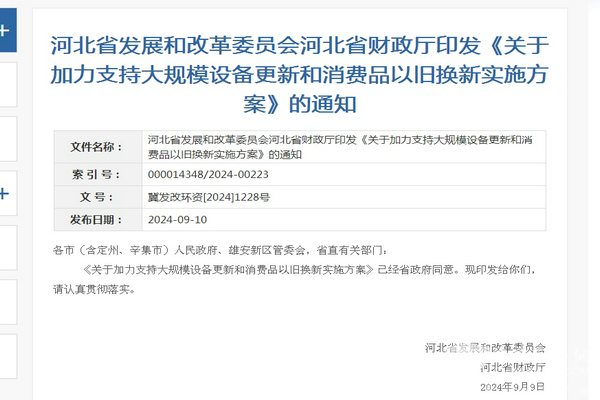 2024年9月9日,河北省发展和改革委员会、河北省财政厅联合印发了《关于加力支持大规模设备更新和消费品以旧换新实施方案》的通知【冀发改环资[2024]1228号】