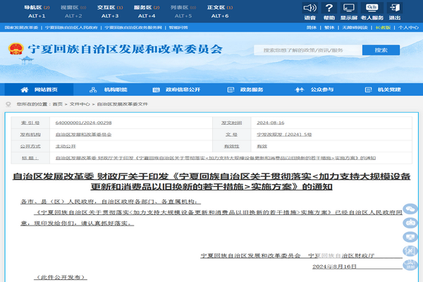 2024年8月16日,宁夏回族自治区发展和改革委员会、宁夏回族自治区财政厅联合印发了《宁夏回族自治区关于贯彻落实<加力支持大规模设备更新和消费品以旧换新的若干措施>实施方案》的通知【宁发改规发〔2024〕5号】。