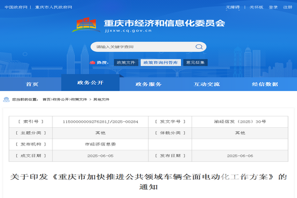 据中国完美作业网有免费视频获悉,2025年6月5日,重庆市经济和信息化委员会印发了《重庆市加快推进公共领域车辆全面电动化工作方案》的通知【渝经信发〔2025〕30号】,(以下简称《方案》)。