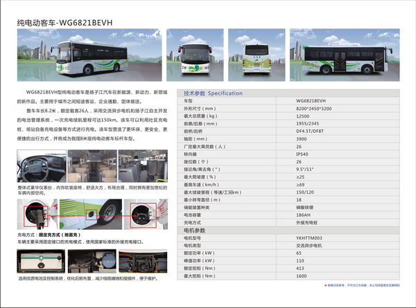 扬子江威虎T1(WG6821BEVH)纯电动客车是扬子江汽车在新能源、新动力、新领域的新作品,专为满足短途客运、企业通勤、团体接送等需求打造的一款节能环保的全新8.2米级产品,具有安全可靠、运行平稳、安静舒适的特性,续驶里程完全符合城市路况,整车采用纯电动运行模式,空调系统及动力系统能量均由车载电池供给,实现整车有害物质零排放。扬子江潜心研究车身构架设计,匹配合理电池组数,使整车达到最佳营运效果。