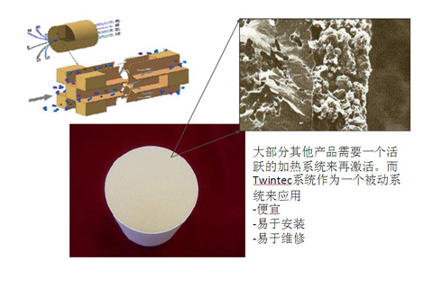 Twintec柴油微粒过滤器(DPF系统)是一个封闭的,被动的系统。它能够几乎完全清除柴油发动机排放的尾气中的致癌煤烟,碳氢化合物(HC)和一氧化碳(CO)。该过滤器系统的自清洁功能使复杂的再生程序和柴油机添加剂作为再生援助的使用成为多余的。