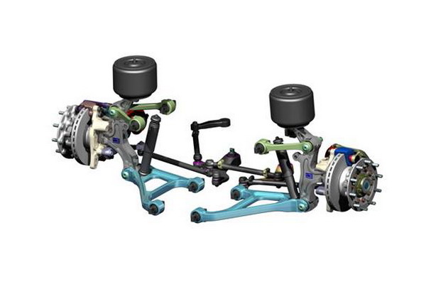 Þ 高刚度双A臂结构、宽气囊跨距、非簧载质量低,动载冲击较小,三段式转向机构