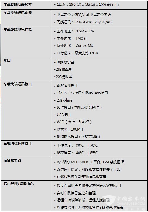 有完整的车况信息记录和处理、远程传送和故障诊断(OBD-2接口)、车辆维护保养管理等功能;