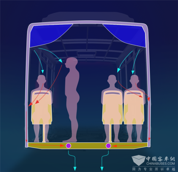 除了改善原有公交⻋车内空气循环路路径长且循环深度不不够的缺点,车内空气排出时通过特别设计的多功能杀毒过滤处理理系统,经过滤净化后再排出⻋车外,避免造成⼆次污染。