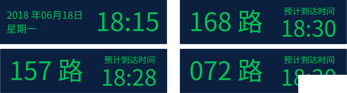双字LED预报站显示,可实时显示车辆到站信息,距离本站还有几站,低功耗、易安装等。
