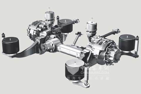 ZF供应完整的AV132门式车桥系统,除了带有盘式或者鼓式制动器以外,还包括悬挂所需的所有部件,例如气囊,减震器及ABS/ASR和制动磨损传感器。AV132在轮边实现了可装配的轴头轮毂单元,这样单个车桥就可以减少10kg的重量,整个车桥桥的重量不到800kg。同时易维护的轮毂单元可以减少更换制动蹄的时间。独特的锥齿轮传动确保运转平稳。门式桥内的两级传动使驱动桥的设计更加紧凑,低桥壳和偏置差动器的布置为无台阶的车厢提供了更大的空间。AV132有多种型号以满足当前各种车辆传动系的应用需求。