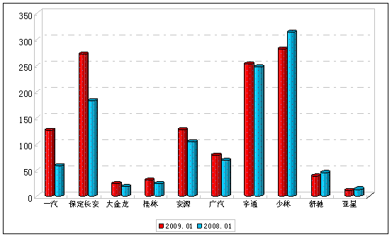 图一:2009年1月小型客车销售增长前10名销量图