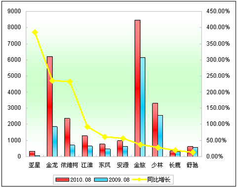 2010年前8月小型客车销售增长TOP10