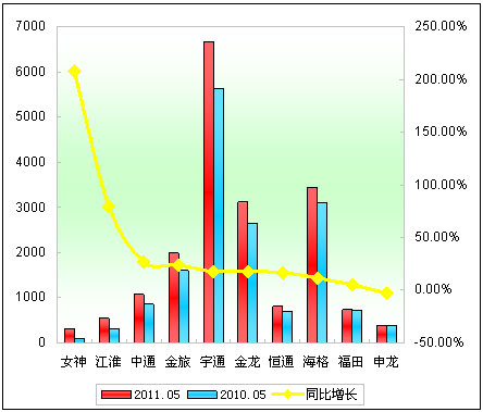 2011年前5月大型客车销售增长TOP10