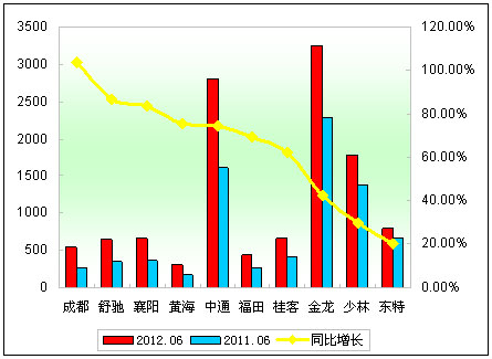 注:由于存在边际报酬递减规律以及农历春节的原因,2012年前6月累积销售量未超过200辆中型客车的企业未纳入统计体系。