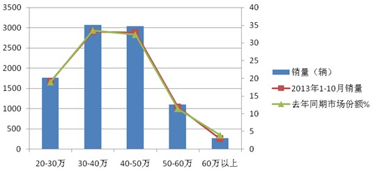 1、2013年1-10月,40-50万和30-40万两价格区间,是CNG客车销量最大的两个主力区段,几乎各占据总体销量的三分之一。其余区间销量较少,销量分布出现了“两头小,中间大”的市场迹象。