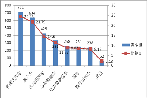 1、按用途种类划分销量比例分析。根据市场调研,2013年国内客车专用车的市场保有辆大约在10000辆左右。2013年的市场需求量为2910辆。其中需求量最大的是物流、广告行业的客厢式货车, 2013年客车专用车需求按种类需求数量大体如下表: