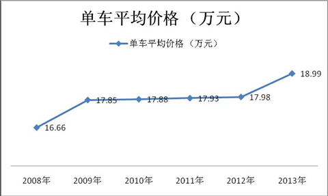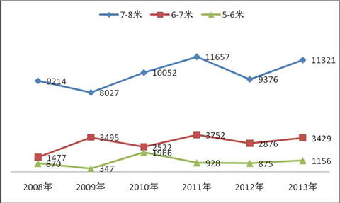 由上图看出:近5年7~8米公交车单台平均销售价格逐年在上升,从2008年7月1日很多市场开始购买国Ⅲ排放的产品了,而7~8米的国Ⅲ发动机比国Ⅱ发动机价格一般要高2万~3万元左右,因此2009年比2008年单台平均价格高出1.19万元是完全符合市场情况的,以后每年的价格上涨幅度就小多了,同样,2013年比2012年单价上升了近1万元,也是因为2013年7月1日起开始执行国IV排放导致价格上升。从上面的图表也可以看出:城乡公交车的档次随着时间的推移也在逐步提高,同时也反映了目标消费者随着生活水平的提高对城乡公交车的档次和舒适性等要求也越来越高了。