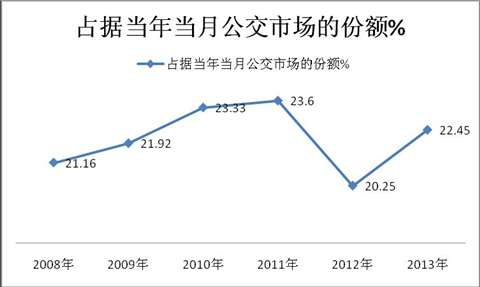 3、近6年来城乡公交市场销量占据当年公交总体市场的份额在前4年均在逐年攀升,且都在20%以上,但到了2012年却出现了向下拐点的现象,到了2013年,比例又开始出现恢复性上升。