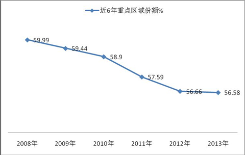 三、主流市场仍然是城乡公交的主要分布区域,销量发展无明显规律,但近6年来的垄断程度在逐年下降,其他非重点区域市场的市场机会在加大,中国农村经济发展的地区随城乡一体化的推进正在逐步缩小。