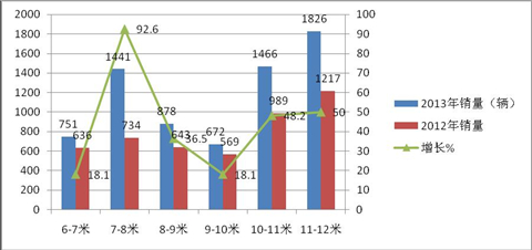 1、2013年LNG客车市场中,11-12米车型的LNG类客车销量最大,其次是10-11米,两者之和接近47%,说明10米以上大型客车是LNG类客车的主体。这主要是因为10米以上大型LNG类在公交车中比例较大,在全国大中城市中,燃气类客车主要以10-12米为主,一方面是因为大中城市人口流动较多,大型公交载客较多,可以充分缓解城市交通拥挤阻塞的情况,同时大型客车搭载LNG类天然气,回报率较好,经济效益可观。