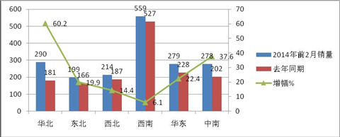 从上图表可知:2014年前2月,全国各大区域CNG客车销量中,西南区域最多,其次是华北区域,再次是华东区域;同比增幅最大的是华北区域市场,其次是中南区域。而且所有区域市场下来同比均处于上升状态。