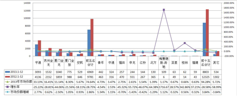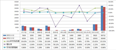 图1:2012-2013年大中型客车产品分长度规格销售量对比图