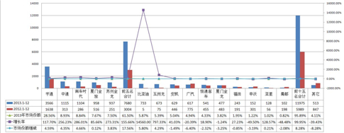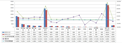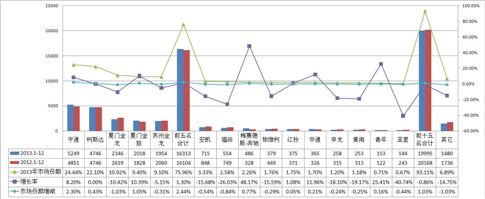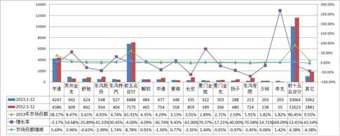 前十五家企业合计销售19995辆,占据大中型团体市场份额的93.11%(详见图8),同比2012年提高1.03%。