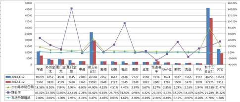 根据国内上牌数据统计,2013年大中型客车共计销售客车151835辆,比2012年140099辆增长了8.38%,从区间段来看,只有9-10m呈现15.27%下滑,其余各区间段均增长,其中10-11m和11-12m增幅达到2位数,8-9m增幅达到9.28%,7-8m略有增长(详见图1)。