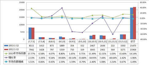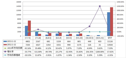 分析显示:2013大中型客车市场中,7-8m占据30%左右份额,11-12m占据25%左右份额,8-9m和10-11m占据20%左右份额,9-10m占据5%左右份额;从各区段市场份额增减来看, 7-8m和9-10m市场份额分别降低1.81%和2.52%,而10-11m增幅最大,达到3.27%。