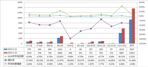 数据显示:2013年大中型公路客车累计销售38732辆,同比增幅4.85%,其中8-8.5m、8.5-9m、10.5-11m增幅达到2位数以上,7-7.5m同比增幅达到9.63%,而9-9.5m、9.5-10m、10-10.5m和11-11.5m下滑幅度较为明显(详见图3)。