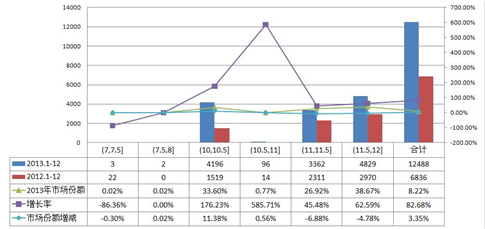 数据显示:2013年大中型新能源客车市场累计销售12488辆,同比增幅达到82.68%,从米线段来看,10-10.5m销售4196辆,同比增幅176.23%,占据市场份额的33.60%;11-11.5m销售3362辆,同比增长45.48%,占据市场份额的26.92%; 11.5-12m销售4829辆,同比增长62.59%,占据市场份额的38.67%(详见图11)。