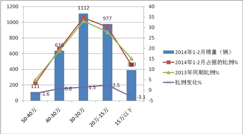 2、销量比例最大的区间是30万-20万,比例占据了34.6%,而2013年同期的比例为33.1%,同比有增大趋势;其次是20万-15万,占据的比例为30.3%,2013年同期为27.8%;销量比例也有增大趋势。