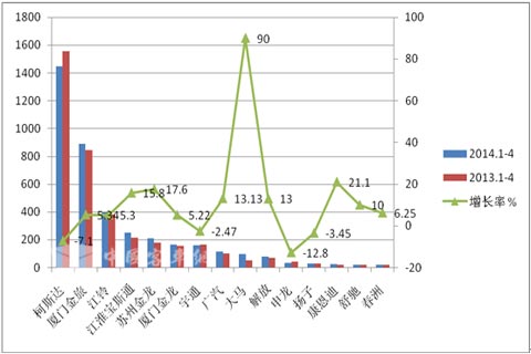 6、2014年1-4月考斯特客车总体销量同比增长了0.3%。
