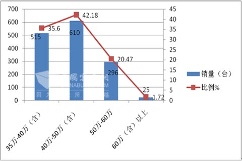 (一)高端考斯特销量的大哥大----一汽丰田柯斯达2014年1-4月累计销量为1446台,比去年同期下降近7.1%,主要分布区域市场在广东、江苏、北京、山东、浙江、四川、上海等区域。主要目标客户群体是旅游客运和政府公务用车;价格在40-50万是其销量比例最大的价格区间。