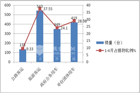 丰田考斯特1-4月最大的目标客户群体是旅游客运,其次是单位团体用车,再次是政府公务用车,最小的是公路客运。
