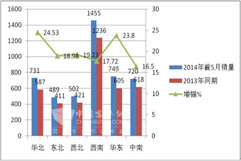 从上图表可知:2014年前5月,全国各大区域CNG客车销量中,西南区域最多,其次是华北区域,再次是华东区域;同比增幅最大的是华北区域市场,其次是华东区域。而且所有区域市场下来同比均处于上升状态。