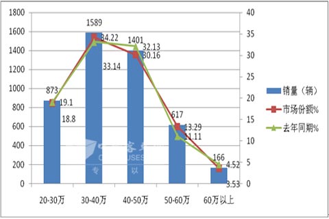 特点三:价格链条较短,30-40万销量最大,且同比有上升趋势,低价饹和高价格销量较小,且同比有萎缩态势