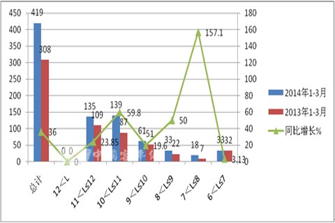 (二)公路客运市场---10-11米销量最大,7-8米增幅最大;CNG公路客车占据CNG总量的比例为9.0%,同比2013年提高了1.1个百分百点,但权重仍然较小。