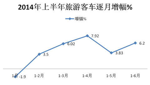 2014年1-6月旅游客车依然增长,增幅达到6.2%。同时可看出,从2014年1-6的逐月的增幅中,前4月从1月的负增长逐步升高,到1-4月增幅达到最高,1-5月降到3.83%,1-6月又升高到6.2%,因此可以说,2014年上半年各月旅游客车增幅忽高忽低,呈现一波三折态势。