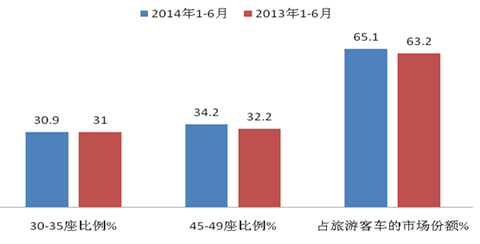 3)30-35座占旅游车销售的比例为30.9%,比去年同期的31.0%,低出0.1个百分点,45-49座占旅游车的比例为34.2%,比去年同期的32.2%也高出2个百分点,集中度有较大幅度提高,说明2014年1-6月旅游客车有大型化的发展趋势.也反映了今年1-6月旅游客车虽然增幅不是太大,但旅游客源仍然上升,过去一直困扰大车空载率和回报率的问题已经初步得到改善。旅游经营者原来认为运营风险增大,但随着旅游市场的利好发展,必然导致45-49座的旅游车销量比率相对上升更大的现象.今年旅游大车的绝对销量必然是上升的.