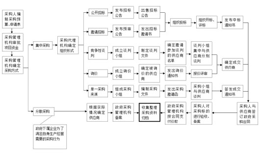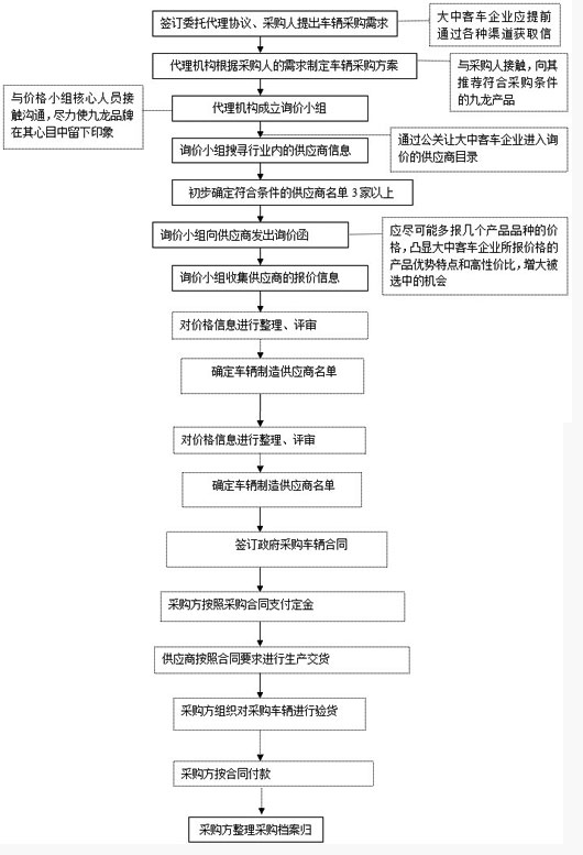 从上图表可知,2013年的大中客政府采购市场份额相对2012年有所下降,2014年1-7月政府采购的市场份额相对2013年又有所下降。根据专家预测,主要是因为受到中央“八项规定”和反腐力度加大等政策的影响,2013年及2014年1-7月的政府“三公”消费受到压缩,政府采购大中客的经费也有所消减所致。以下着重研究政府采购大中客的流程路径及大中客企业的应对策略。