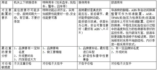根据市场调研,政府采购大中客车的用途及行为特征偏好分析主要如下表: